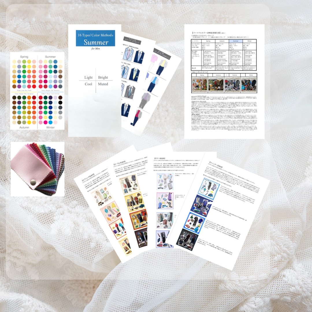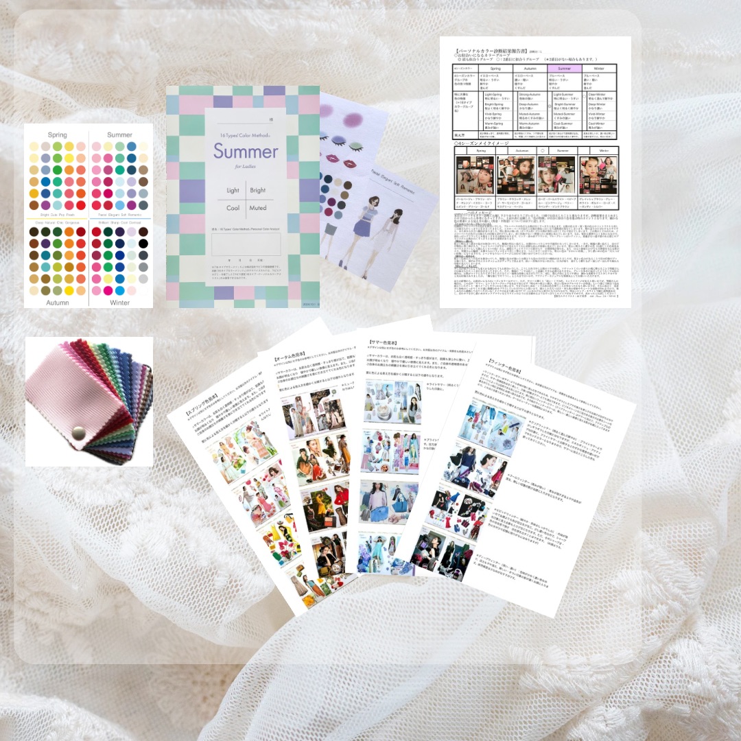| 特典 | カラー・コスメイメージ参考写真付 | ・カラーサンプルカード ・16タイプアドバイスシート ・色布見本帳 ・結果報告書付 | 無 | 骨格別シルエット資料 (PDF) |